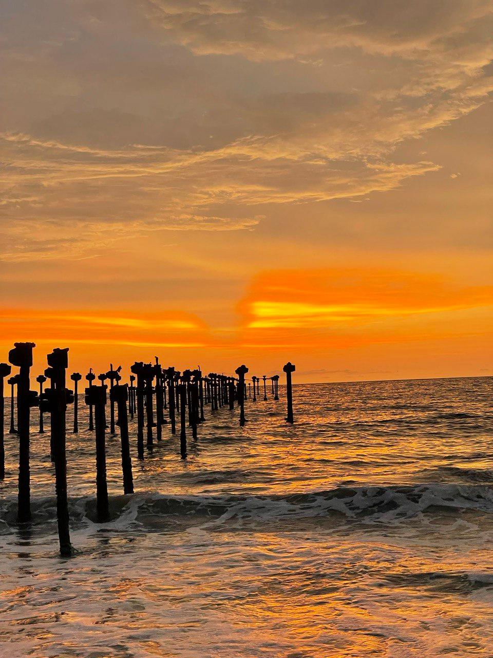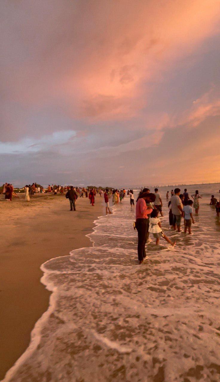 Здесь есть пляж, на котором по вечерам посмотреть на заката, казалось, собирается вся Индия. Он закрыт для купания в это время года из-за неспокойного океана: отливом быстро уносит от берега, а волна может у дарить с такой силой, что потеряешь сознание.